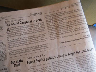 In the very next letter, titled “Forest Service public scoping to begin for road access,” Tusayan’s mayor, Greg Bryan, argues for the development. “Most of us came here to work and be a part of this wonderful experience that the Grand Canyon offers. Our goal in developing housing is not to ruin that experience or the resource, but rather to give the people who serve our resource and its visitors a better quality of life while doing so.”