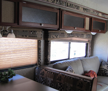 This our Class C rig has four overhead bins along the top of this slide-out where the dinette sits. They’re sort of like the overhead bins in an airplane, hinged at the top but much, much smaller than airplane bins.
